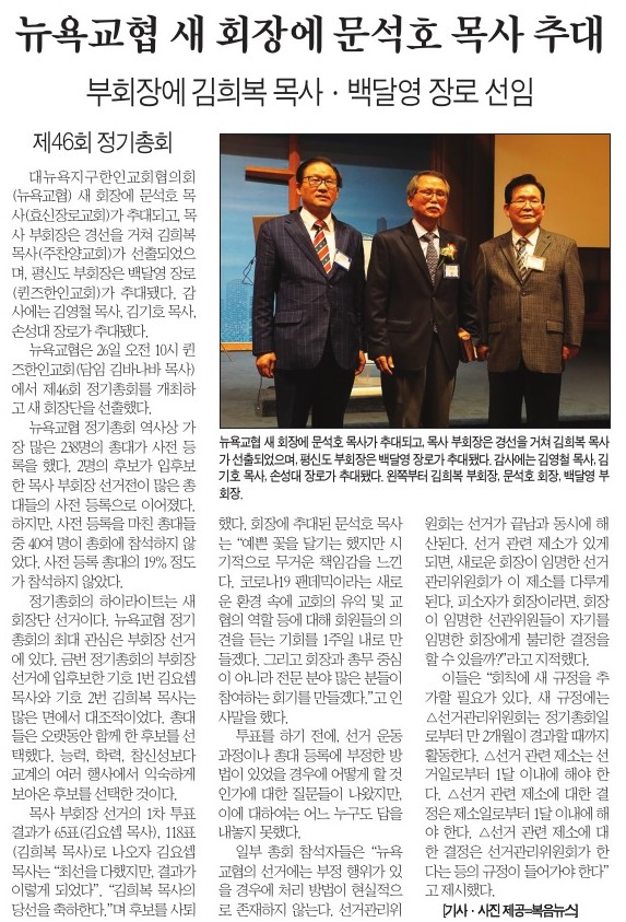 복음뉴스 제공 2020년 10월 28일(금) 자 뉴욕일보 A2면 기사