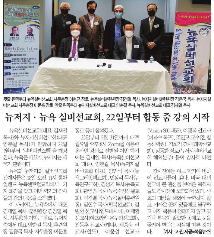 복음뉴스 제공 2021년 3월 20일(토) 자 뉴욕일보 A2면 기사
