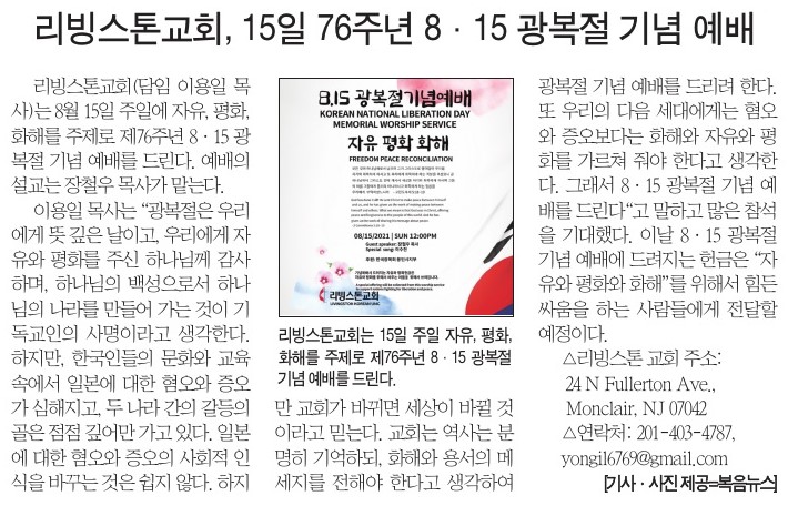 리빙스톤교회, 15일 76주년 8.15 광복절 기념 예배