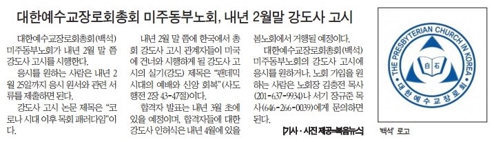대한예수교장로회총회 미주동부노회, 내년 2월말 강도사 고시