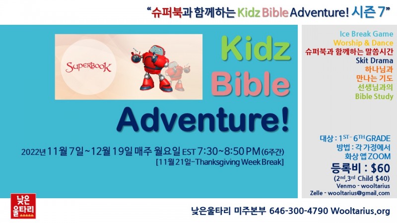 KIDZ BIBLE ADVENTURE 시즌7은 2022년 11월 7일 부터 12월 19일까지(11월 21일, Thanksgiving Week 휴강) 매주 월요일 미주동부시간 7:30~8:50 PM 6주간 진행됩니다.