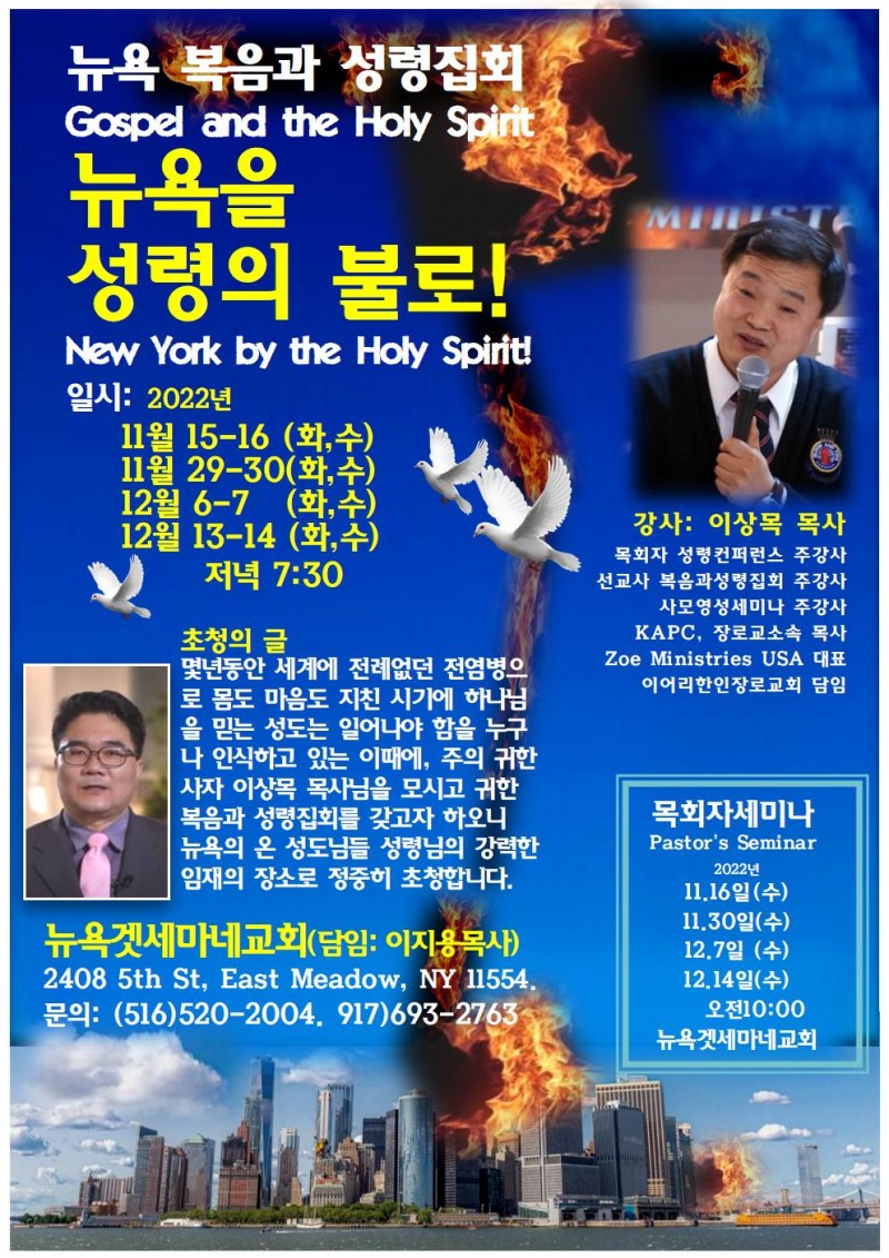복음과 성령집회를 갖고자 하오니 뉴욕의 온 성도님들 성령님의 강력한 임재의 장소로