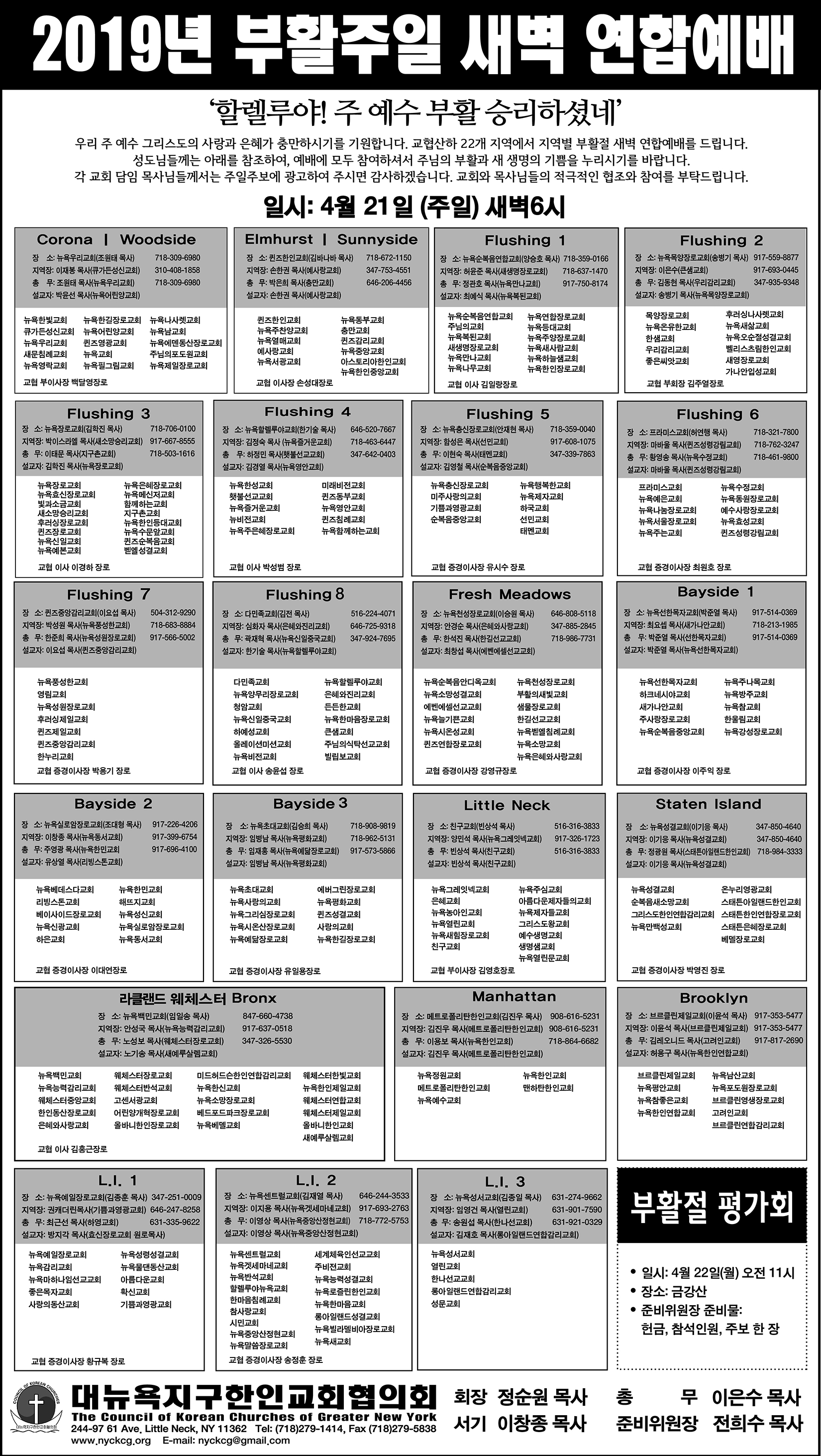 지역장: 박이스라엘 목사(새소망승리교회) 917-667-8555/ 총무: 이태문 목사(지구촌교회) 718-503-1616