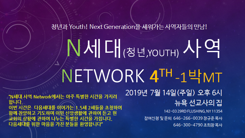 Network for N Generation Ministry is planning a very special event! For this meeting, we are inviting 1.5 and 2nd generation leaders of the next generation for a time of praise, prayer, and sharing on the topic of immigrant faith and the state of the present church. All who have a passion for the next generation are welcome!
