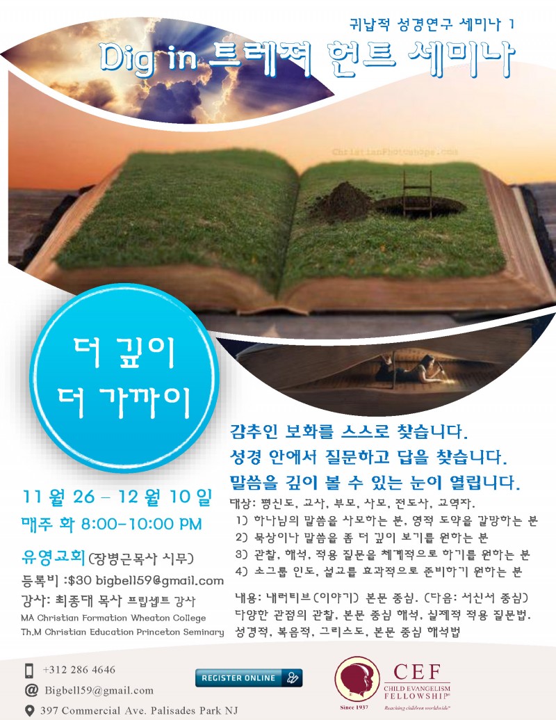 오랫동안 영적인 정체기를 경험하시거나, 성경에 대해서 좀 더 깊이 배우기를 원하시거나, 소그룹원이나, 자녀, 학생들에게 하나님의 말씀을 잘 가르치시기를 원하신 분들을 초대합니다. 이 세미나를 통하여 하나님의 보물을 함께 찾기를 원합니다.