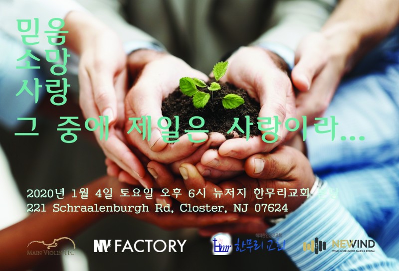 2020년 1월 4일(토) 오후 6시 선교콘서트가 한무리교회에서 열립니다. 음악과 하나님의 사랑을 함께나누는 귀한 시간이 될것입니다. 모든 Ticket 수익금은 선교후원금으로 사용됩니다. 많은 참여바랍니다. 뉴저지 한무리교회 221 Schraalenburgh Rd, Closter, NJ 07624 Tel : 201-440-4588 http://www.hanmoory.org