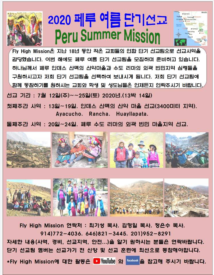 2020년에는 하나님께서 Fly High Mission 팀을 남미 페루로 2주간 보내 주십니다.