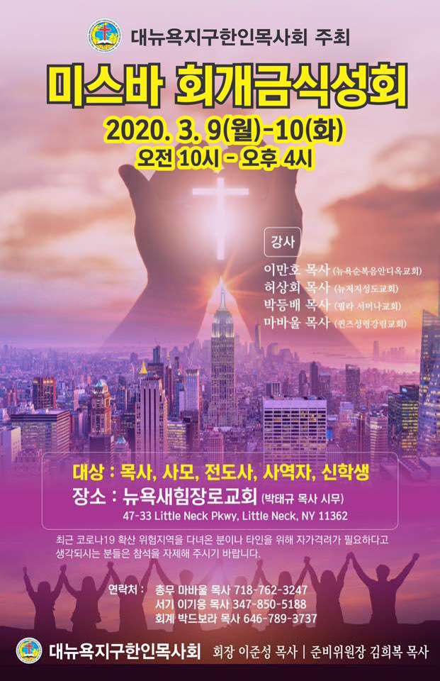 코로나 바이러스 19의 영향으로 일정이 조정되었습니다. 당초 3일 동안 가지려던 성회가 이틀로 단축되었습니다. 3월 9일(월) 오전 10시부터 오후 4시까지, 3월 10일(화) 오전 10시부터 오후 4시까지 진행됩니다. 착오 없으시기 바랍니다.