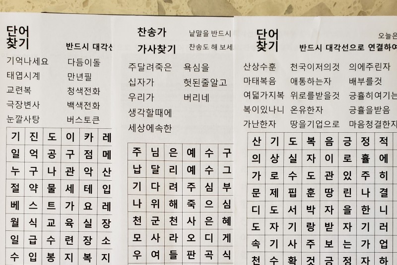 매주 두 장의 퍼즐이 이메일로 제공됩니다. 어르신들이 공감하실 수 있는 일반주제의 퍼즐 2장이나 신앙/찬송가 퍼즐 한 장 + 일반 퍼즐 1장 중에서 선택하실 수 있습니다. 무료이고 상업적인 목적은 하나도 없습니다. 개인분들의 요청도 감사하며, 교회나 단체에서 받으셔서 복사하시고 나눠주신다면 더 많은 시니어들께서 이 힘든 시간에 아주 조금이나마 도움이 될 것입니다.