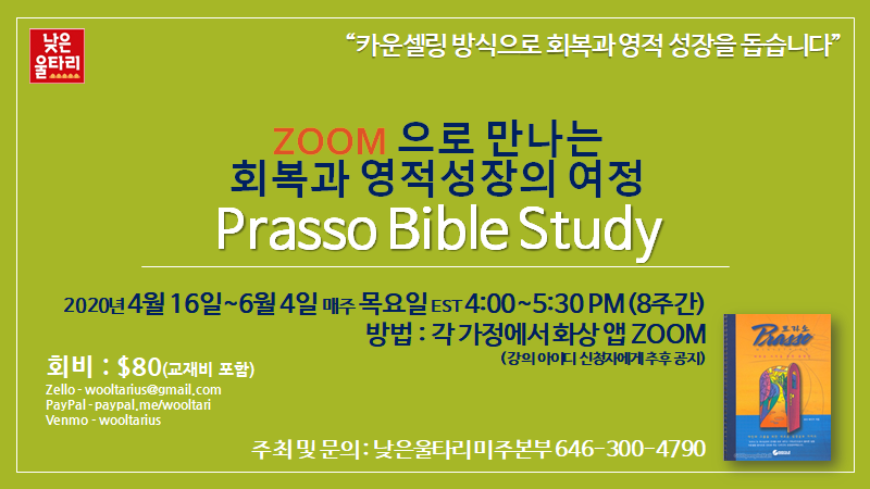 낮은울타리 미주본부(대표 : 조희창 목사)에서 성경말씀을 바탕으로 카운셀링 방식으로 회복과 영적 성장을 돕는 프라소 성경공부 과정을 화상앱 Zoom으로 엽니다.