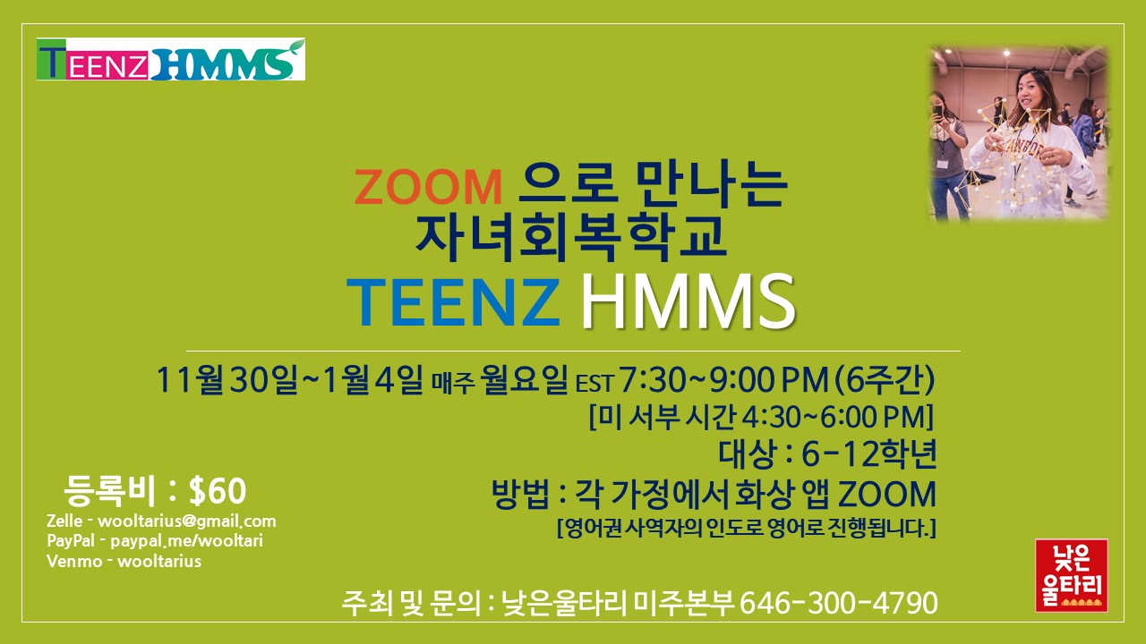 낮은울타리 미주본부(대표간사 : 조희창 목사)에서 이번 연말 N세대 자녀들을 위한 <자녀회복학교 TEENZ HMMS>를 영어과정으로 열게 되었습니다.