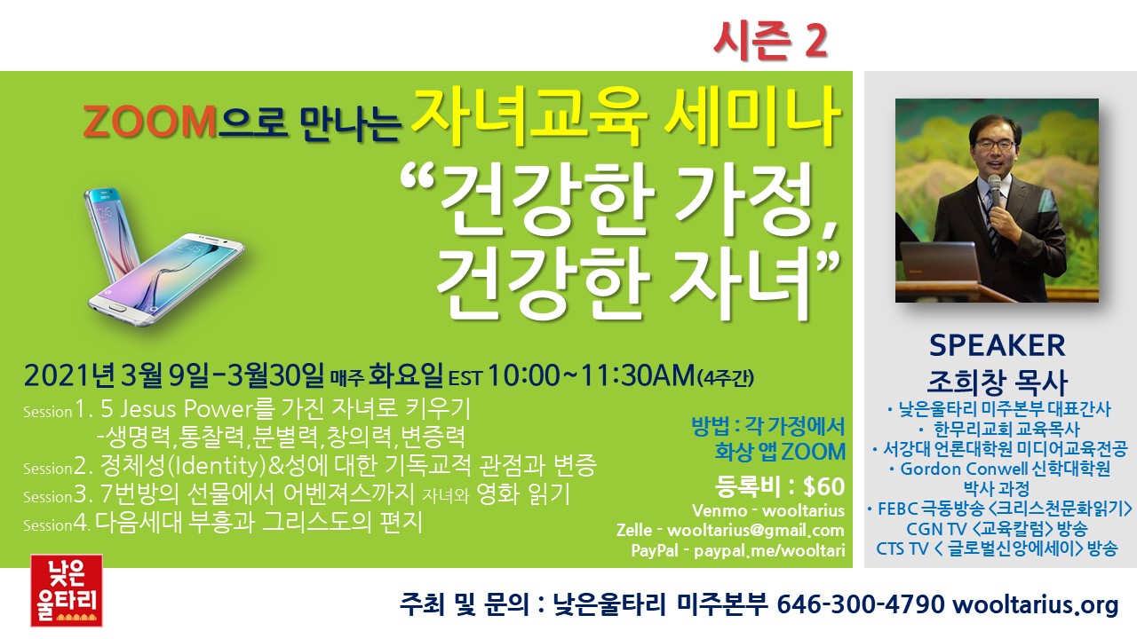낮은울타리 미주본부(대표 : 조희창 목사)에서 <자녀교육세미나-건강한 가정, 건강한 자녀> 시즌2를 엽니다.