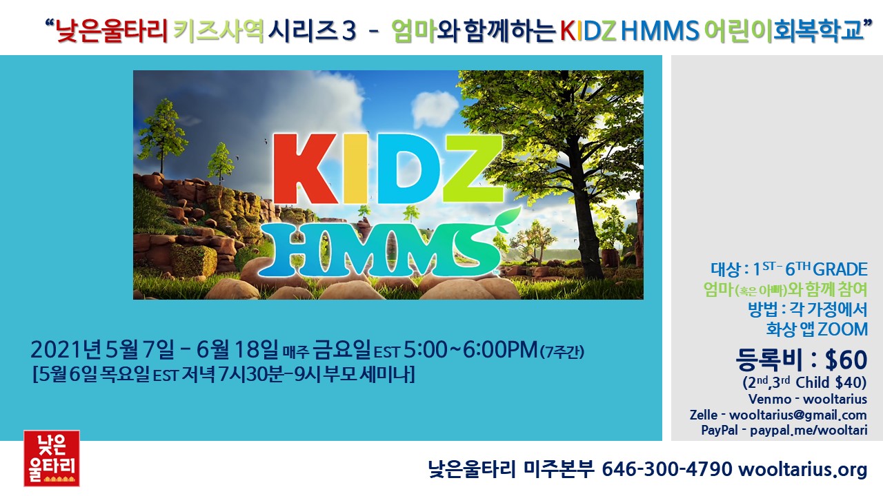 샬롬! 낮은울타리 미주본부(대표간사 : 조희창 목사)에서 "엄마와 함께하는 Kidz HMMS(어린이회복학교)"를 엽니다.