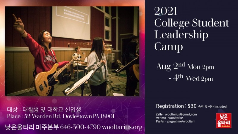낮은울타리 미주본부(대표간사 : 조희창 목사)에서 대학생 및 대학교 신입생을 대상으로 2021 College Student Leadership Camp를 엽니다. 캠프는 2021년 8월 2일(월) 오후 2시부터 4일(수) 오후 2시까지 2박3일간 필라델피아 근교 52 Warden Rd, Doylestown PA 18901에서 진행됩니다. 모든 프로그램은 영어로 진행됩니다.