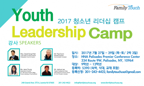 오는 7월 27일에서 29일 목요일부터 토요일까지 가정사역기관 패밀리 터치가 제15회 “성공하는 청소년들의 7가지 습관”을 배우는 리더십 캠프를 주최한다. 이 캠프는 대학진학 이후에도 자기관리와 목표성취에 필수적인 요소들을 인생에서 가장 중요한 시기인 청소년기에 적립하고 연습하도록 계획되었다.