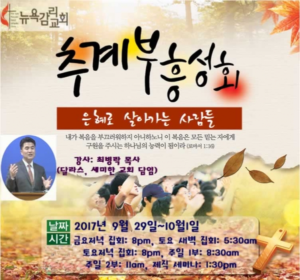 2017 뉴욕감리교회 창립 45주년 기념 추계 부흥회 1. 기간: 9월 29일(금)~10월 1일(주일) 2. 집회 시간: 29일 금요일: 8pm 30일 토요일 새벽: 5:30am / 저녁:8pm 10월 1일 주일 1부: 8:30am / 주일 2부: 11am 제직 세미나: 1:30pm 3. 주제: 은혜로 살아가는 사람들 4. 강사: 최병락 목사(달라스, 세미한 교회 담임)