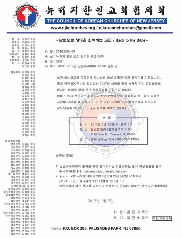 뉴욕교협 2023년 신년감사예배 및 하례식 초청
