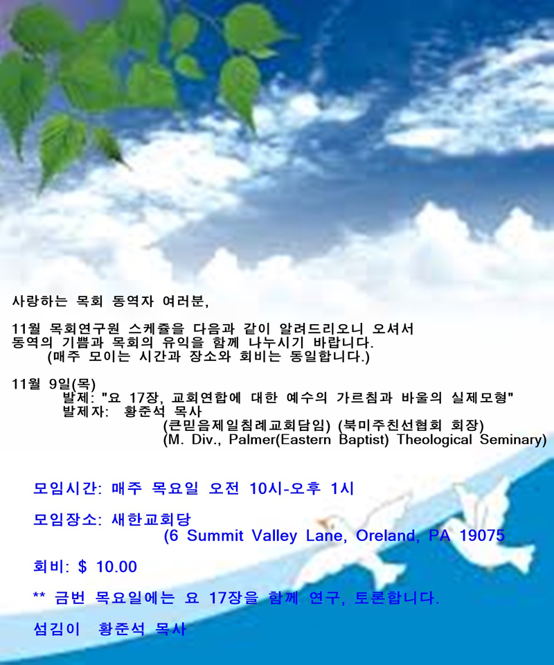 필라목회연구원 11월 9일(목요일) 강좌 안내