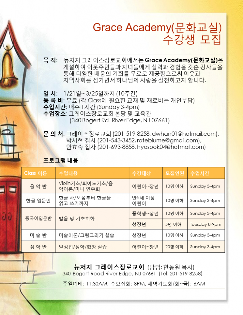 뉴저지 River Edge에 위치한 그레이스 장로교회에서는 1월 21일(주일)부터 10주간 무료 문화교실을 개설합니다. (문의: 201-519-8258, dwhan01@hotmail.com)