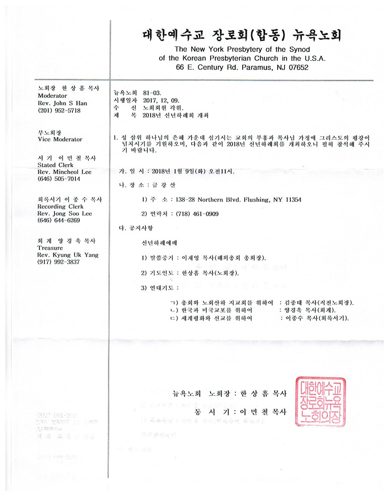 대한예수교장로회(합동) 해외총회 뉴욕노회 신년 하례회
