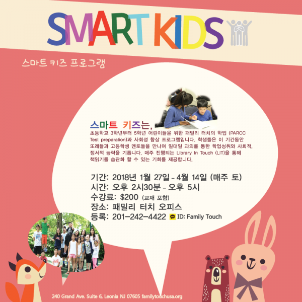 초등학생 3학년부터 5학년을 대상으로 PARCC 테스트를 준비하고 정서적, 사회적 능력을 기를 수 있도록 돕는 패밀리터치의 스마트 키즈 프로그램이 오는 1월 27일 개강합니다. 등록 문의: 201-242-4422 등록신청: https://familytouch.typeform.com/to/bpdiaE