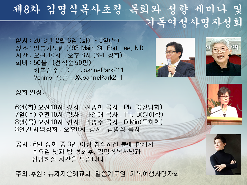 교역자님들과 사명감을 재무장할 필요를 느끼는 모든 분들을 정정히 초대합니다. 2010년부터 매해 거듭해 온 성회이며 지난해까지 목사님 사모님 중심이었느나 금년부터 탁월하신 여성 강사님들을 모시고 여성사명자성회를 추가합니다.