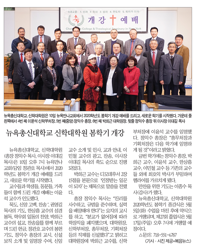 뉴욕총신대학교 신학대학원 봄학기 개강