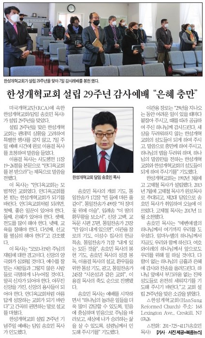 한성개혁교회 설립 29주년 감사 예배 "은혜 충만"