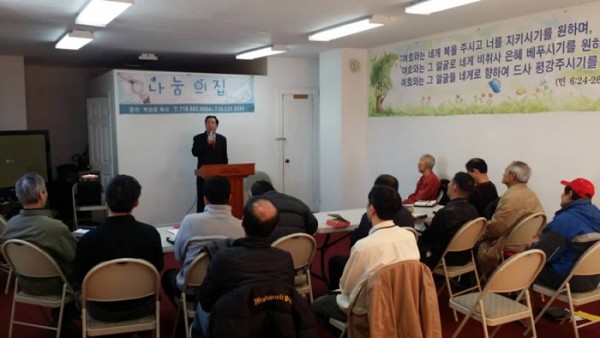 뉴욕의 한인 노숙인들의 쉼터 뉴욕나눔의집(대표 박성원 목사)은 매일 아침예배를 드리고 있다. 1월 13일(금) 오전 10시에 드려진 예배는 뉴욕교협 증경회장단 회장이며 뉴욕성신교회 신현택 목사가 뉴욕나눔의집을 방문하여 말씀을 전하고 사역을 격려했다. 신 목사는 고린도후서 5장17절을 본문으로 “새로운 피조물”이라는 제목의 말씀을 통해 노숙인들에게 “누구든지 그리스도 안에 있으면 새로운 피조물이라 이전 것은 지나갔으니 보라 새 것이 되었도다”라는 기쁜 소식을 전했다.