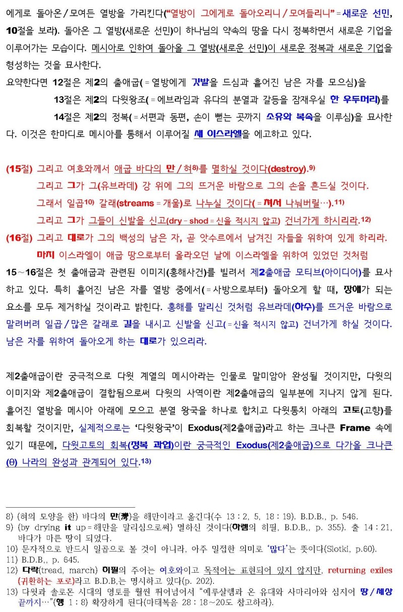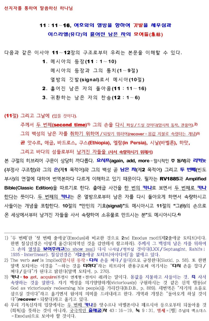이사야 11장 11∼16절, 여호와의 열방을 향하여 깃발을 세우심과 이스라엘(유다)의 흩어진 남은 자의 모여듦(集結) 작성자 정보 한삼현 목사 작성 작성일 2025.08.28 08:44 컨텐츠 정보 목록 본문 ⓒ 복음뉴스(BogEumNews.Com) SNS 공유 관련자료 댓글 0 등록된 댓글이 없습니다. 로그인한 회원만 댓글 등록이 가능합니다. 목록