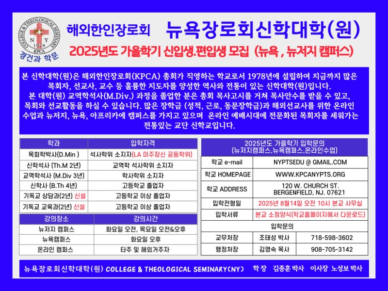 뉴욕장로회신학대학(원) 2025학년도 가을학기 신입샘 및 편입생 모집 공고