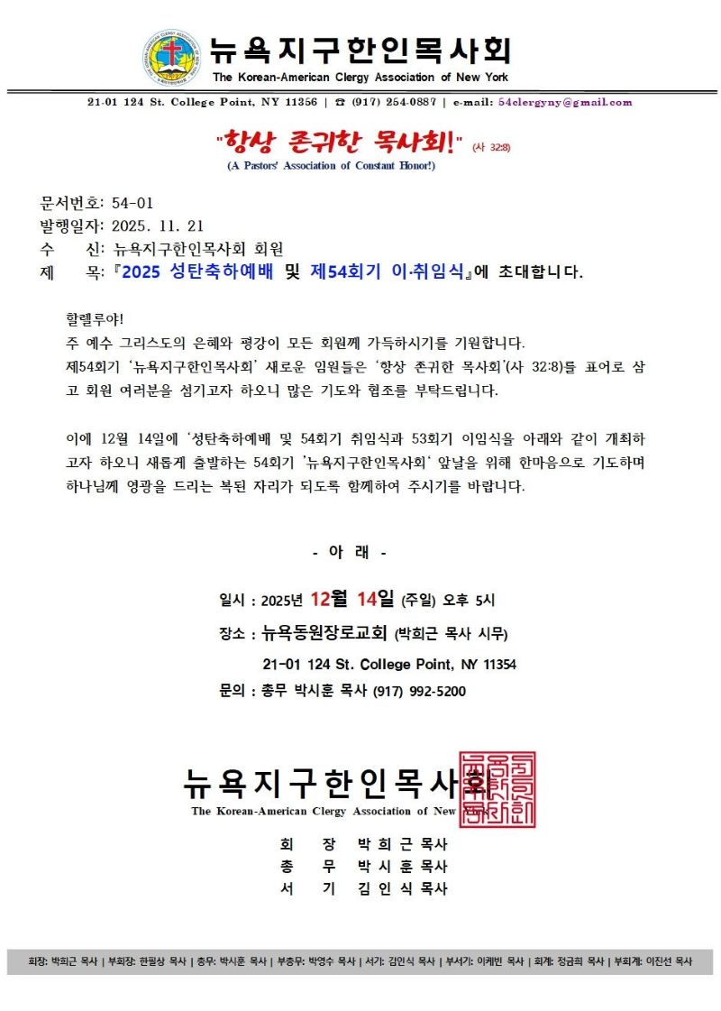 2025 성탄 축하 예배 및 뉴욕목사회 제54회기 이, 취임식