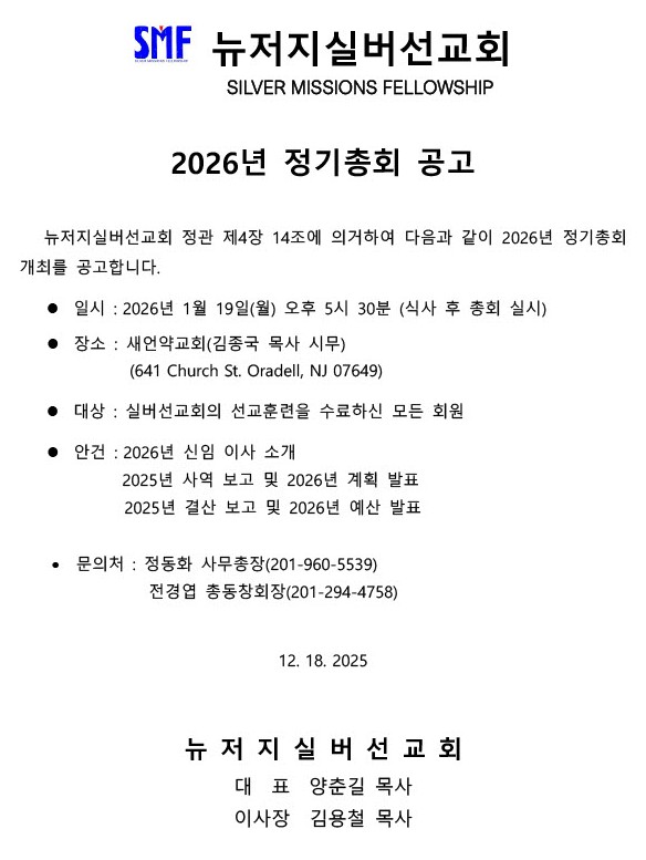 뉴저지실버선교회 2026년 정기총회 공고 작성자 정보 뉴저지실버선교회 작성 작성일 2025.12.18 16:05 컨텐츠 정보 목록 본문 . SNS 공유 관련자료 댓글 0 등록된 댓글이 없습니다. 로그인한 회원만 댓글 등록이 가능합니다. 목록
