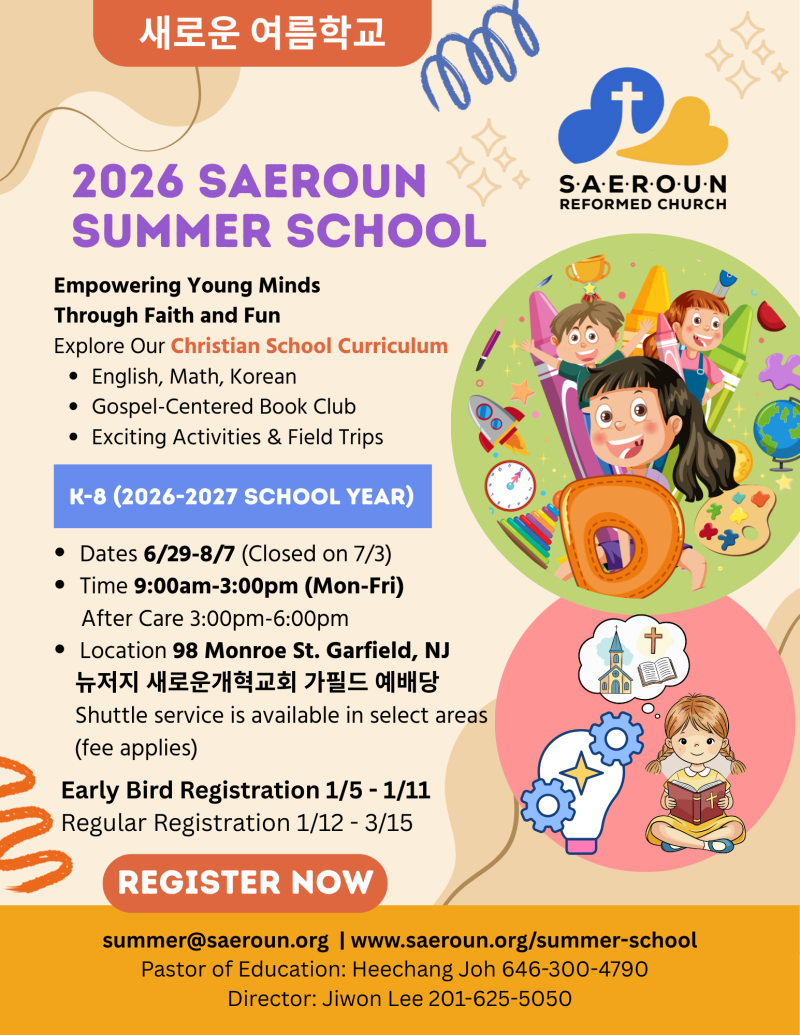 2026년 뉴저지 새로운여름학교(Summer School)는 성경적세계관이 들어간 기독교학교 커리큘럼으로 영어(English),수학(Math),한국어(Korean) 수업을 운영합니다. 새학기 수업준비도 함께 합니다. 매일의 예배와 더불어 다양한 Activity와 Field Trip이 함께 진행됩니다.