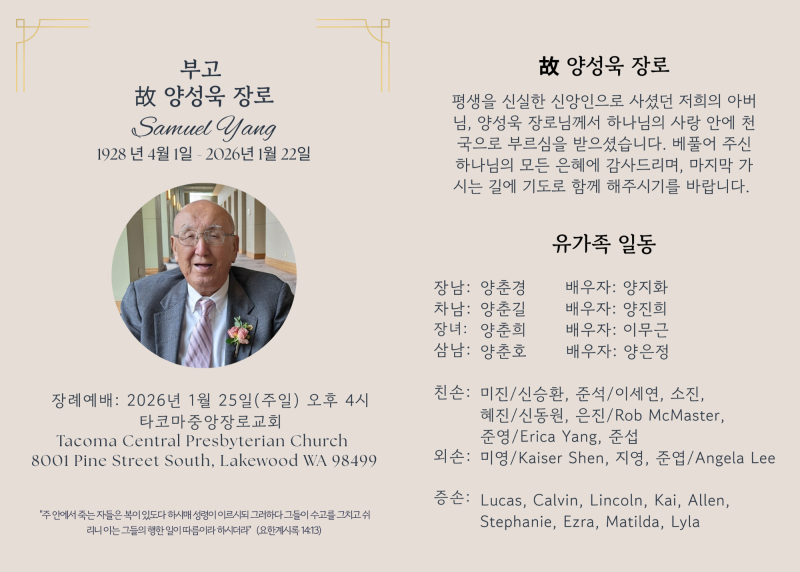 고 양성욱 장로의 장례 예배는 고인이 섬겼던 워싱턴주 레이크우드 소재 타코마중앙장로교회(담임 이형석 목사)에서 1월 25일(주일) 오후 4시(현지 시간)에 드려진다.