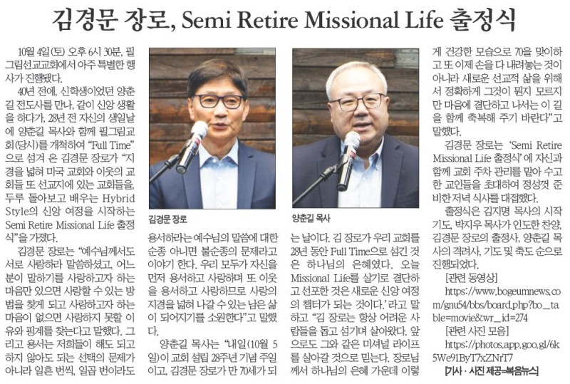 김경문 장로, Semi Retire Missional Life 출정식 작성자 정보 복음뉴스 작성 작성일 2025.10.08 06:30 컨텐츠 정보 목록 본문 복음뉴스 제공 2025년 10월 8일(수) 자 뉴욕일보 A4면 기사 SNS 공유 관련자료 댓글 0 등록된 댓글이 없습니다. 로그인한 회원만 댓글 등록이 가능합니다. 목록