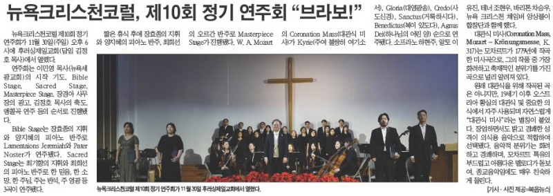 뉴욕크리스천코럴, 제10회 정기 연주회 "브라보!" 작성자 정보 복음뉴스 작성 작성일 2025.12.04 08:20 컨텐츠 정보 목록 본문 복음뉴스 제공 2025년 12월 4일(목) 자 뉴욕일보 A4면 기사 SNS 공유 관련자료 댓글 0 등록된 댓글이 없습니다. 로그인한 회원만 댓글 등록이 가능합니다. 목록