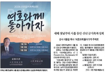 새해 첫날부터 사흘 동안 신년금식축복성회 작성자 정보 복음뉴스 작성 작성일 2025.12.11 08:21 컨텐츠 정보 목록 본문 복음뉴스 제공 2025년 12월 11일(목) 자 뉴욕일보 A4면 기사 SNS 공유 관련자료 댓글 0 등록된 댓글이 없습니다. 로그인한 회원만 댓글 등록이 가능합니다. 목록