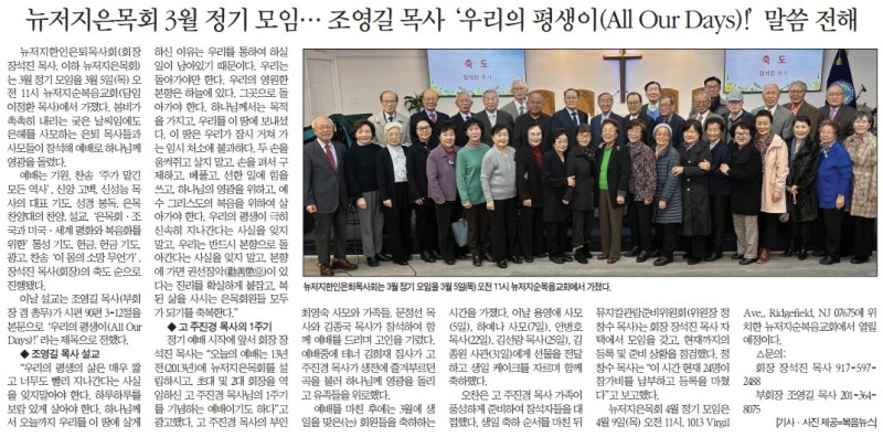 뉴저지은목회 3월 정기 모임 --- 조영길 목사, '우리의 평생이(All Our Days)!' 말씀 전해 작성자 정보 복음뉴스 작성 작성일 2026.03.10 14:25 컨텐츠 정보 목록 본문 복음뉴스 제공 2026년 3월 10일(화) 자 뉴욕일보 A4면 기사 SNS 공유 관련자료 댓글 0 등록된 댓글이 없습니다. 로그인한 회원만 댓글 등록이 가능합니다. 목록