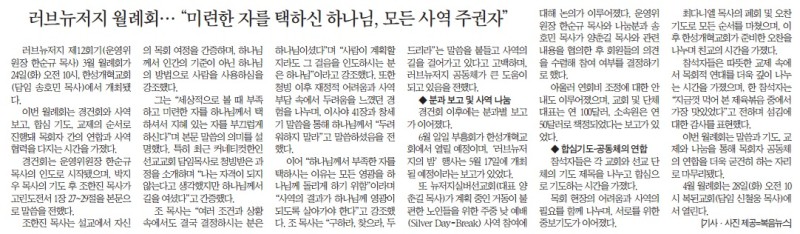 러브뉴저지 월례회 --- "미련한 자를 택하신 하나님, 모든 사역 주권자" 작성자 정보 복음뉴스 작성 작성일 2026.03.25 03:33 컨텐츠 정보 목록 본문 복음뉴스 제공 2026년 3월 25일(수) 자 뉴욕일보 A4면 기사 SNS 공유 관련자료 댓글 0 등록된 댓글이 없습니다. 로그인한 회원만 댓글 등록이 가능합니다. 목록