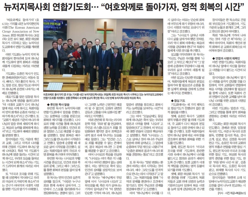 뉴저지목사회 연합기도회 --- "여호와께로 돌아가자, 영적 회복의 시간" 작성자 정보 복음뉴스 작성 작성일 2026.03.28 22:09 컨텐츠 정보 목록 본문 복음뉴스 제공 2026년 3월 28일(토) 자 뉴욕일보 A10면 기사 SNS 공유 관련자료 댓글 0 등록된 댓글이 없습니다. 로그인한 회원만 댓글 등록이 가능합니다. 목록